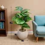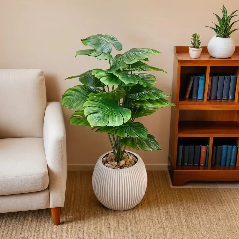 شجرة بوتس اصطناعية تتميز بسيقان طويلة ورفيعة تدعم الأوراق الخضراء الكبيرة ذات الشقوق المميزة، مما يضفي لمسة من الخضرة والحيوية على أي مكان توضع فيه.