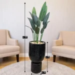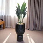 تأتي في وعاء من الفايبرجلاس كبير وعميق بتصميم عصري. لونه أسود لامع مع نقاط بيضاء متناثرة عليه.